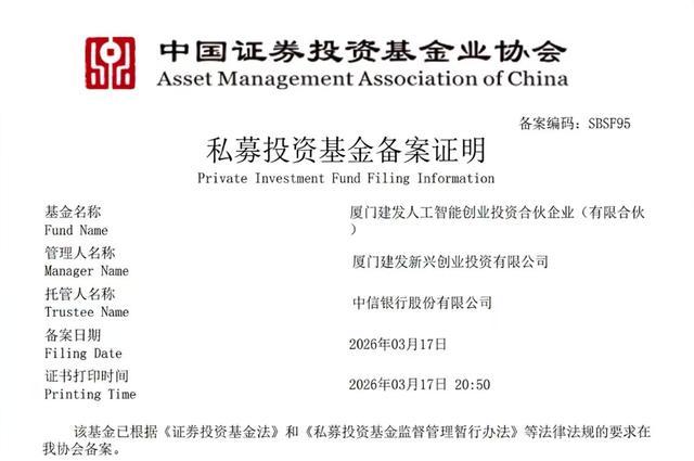 3月18日,据建发集团消息,厦门建发人工智能创业投资合伙企业(有限合伙)(下称“建发AI基金”)已通过中国证券投资基金业协会备案。