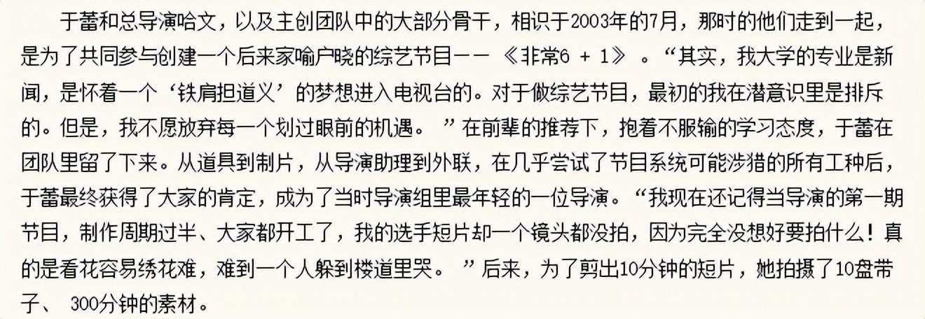 凭借敏锐感知力与高效执行力,2003年她便被《非常6+1》制作团队破格吸纳,成为哈文麾下年轻的节目制作人之一。